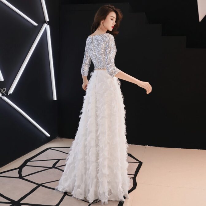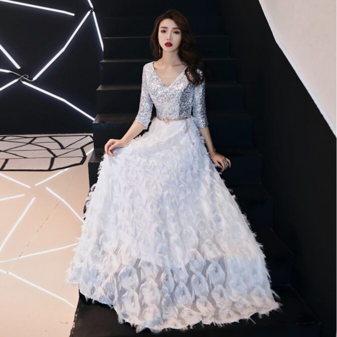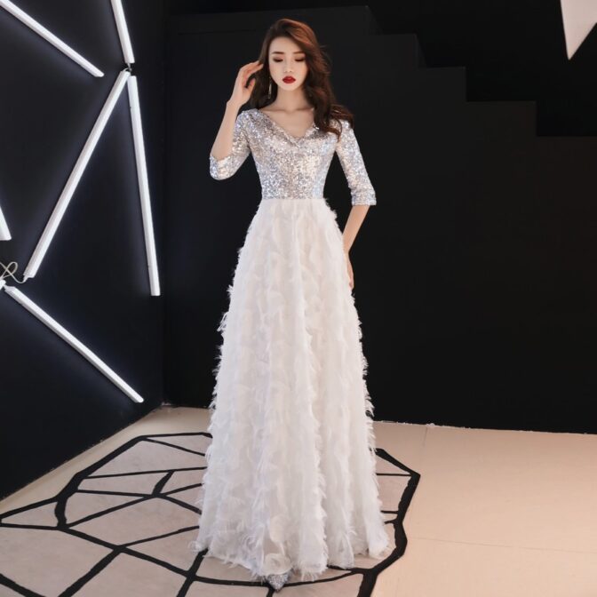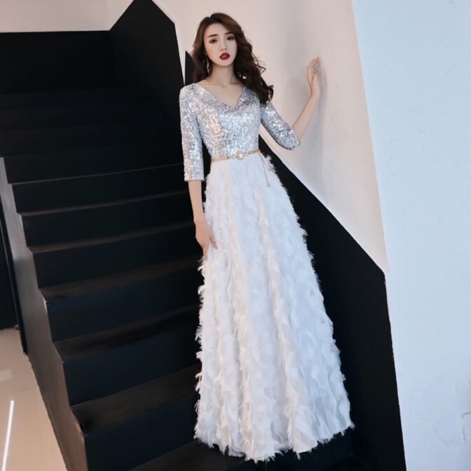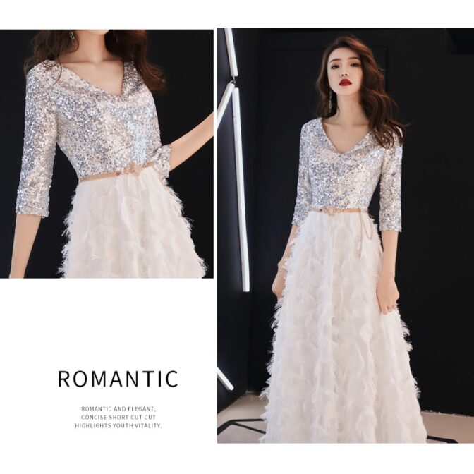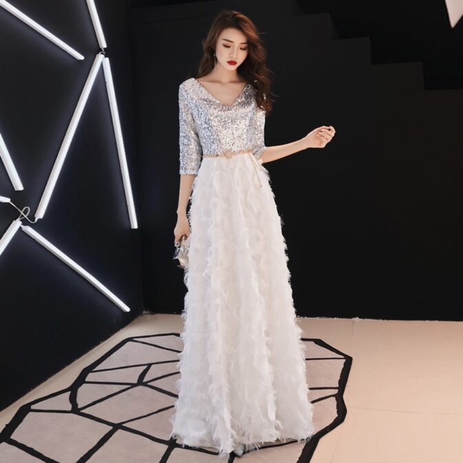キラキラと輝くスパンコールが華やかなVネックパーティードレス。ホワイトのフェザー調ロングスカートが風になびき、パーティーを彩ります。ドレスコードがパーティースタイルでも、個性を出したい方におすすめです。