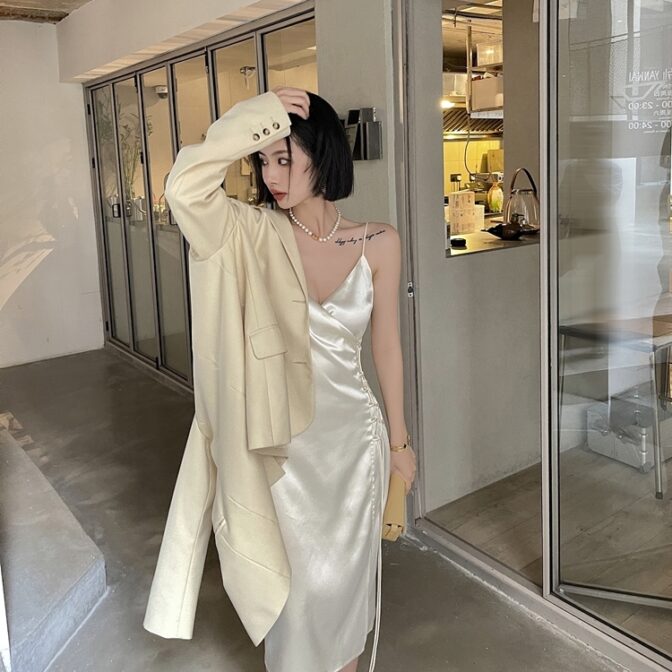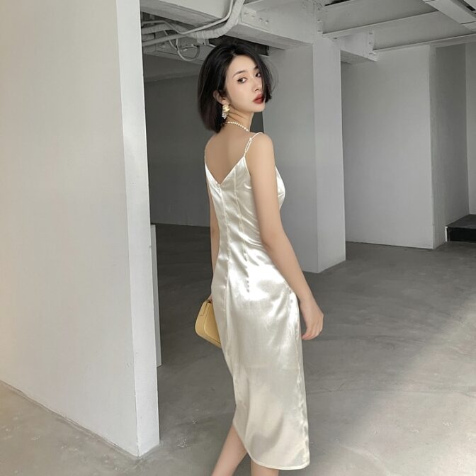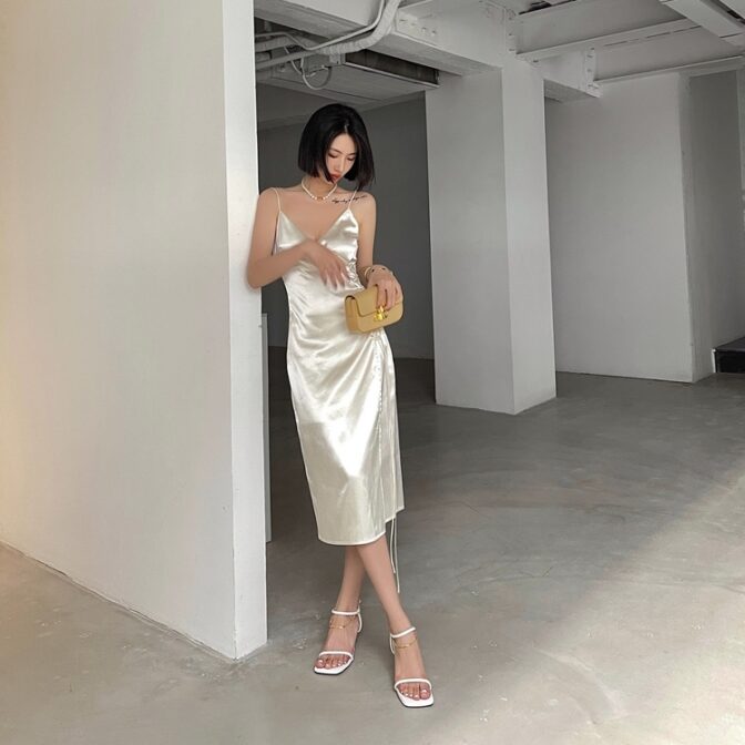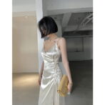 シャンパン★サイドストッパーVネックエレガントドレスワンピ XQ074
