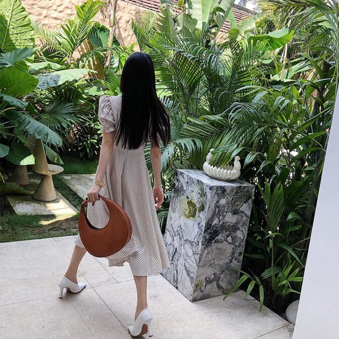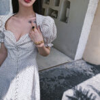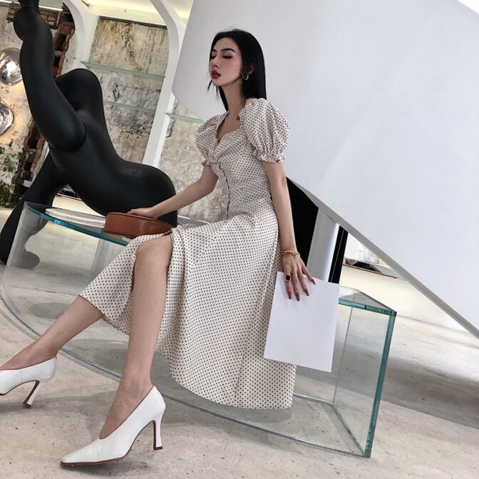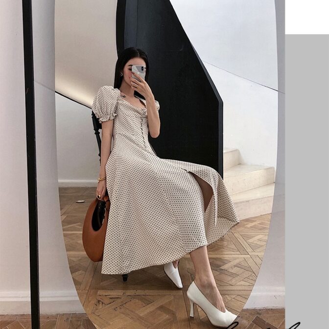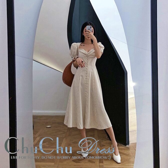 ハートネック★ドット柄パフスリーブロングワンピース XQ021