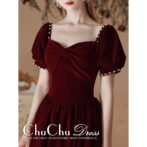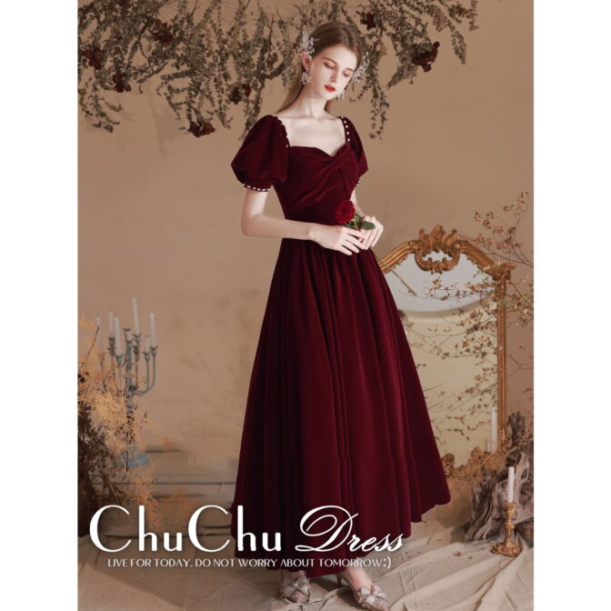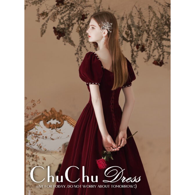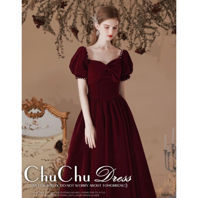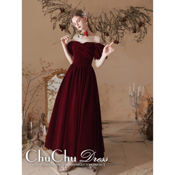 パール装飾☆大人ワインレッドベロアプリンセスロングドレス OJ026