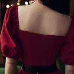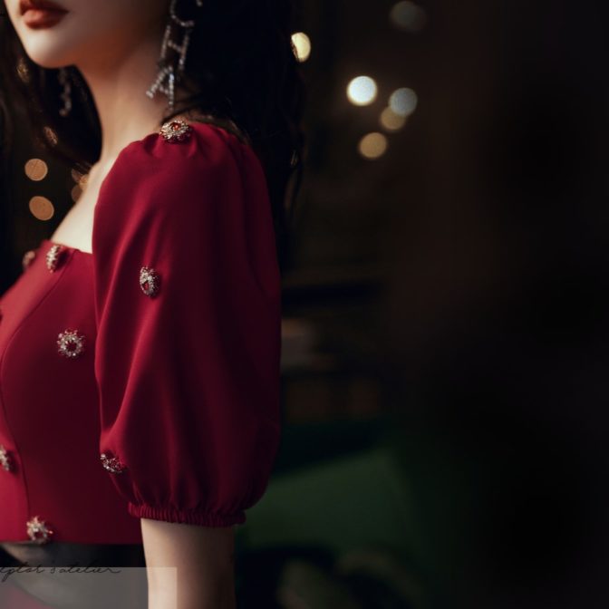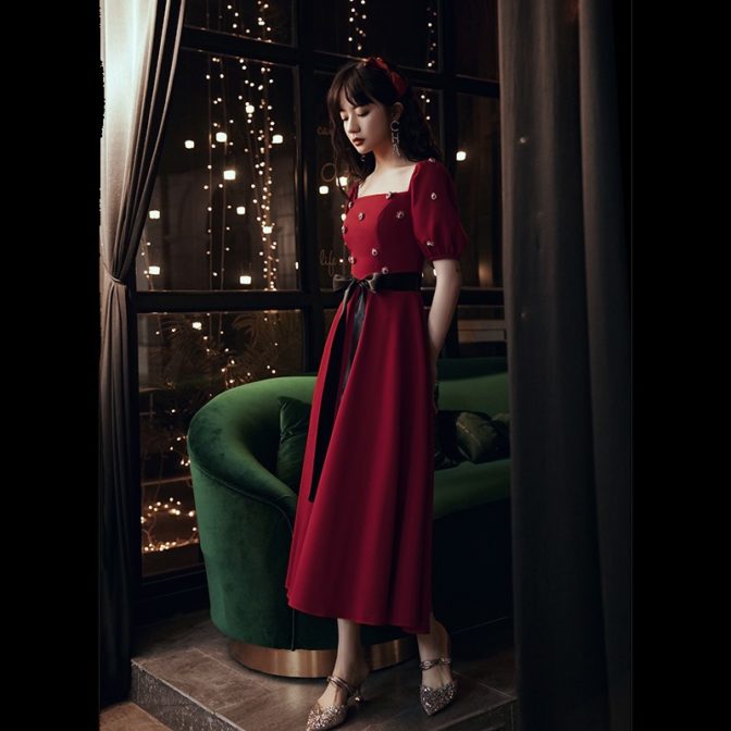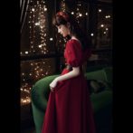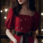 ビジュー装飾パフスリーブミディ丈ドレス MN003