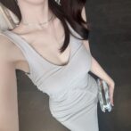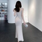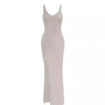 [ワンピース, ロングドレス, エレガント, デート, フォーマル, 韓国ファッション, パーティードレス, おしゃれ, お出かけ, シンプル, グレー, 灰色, Vネック]