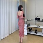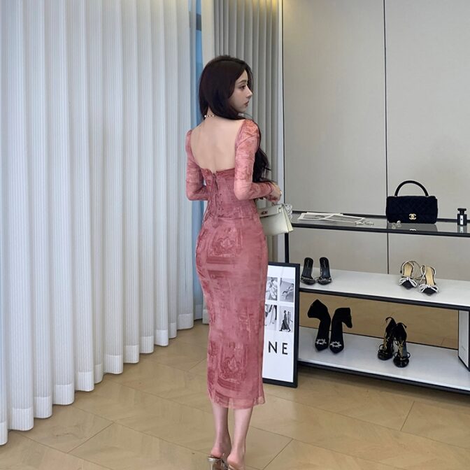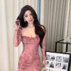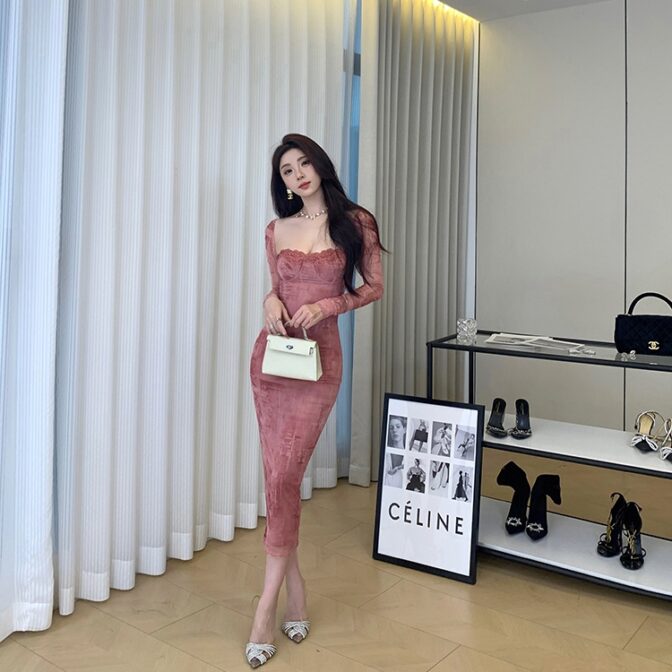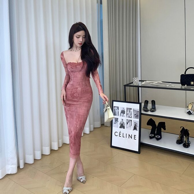 ロングスカート 長袖 パーティードレス くすみピンク 美デコルテライン XQ167