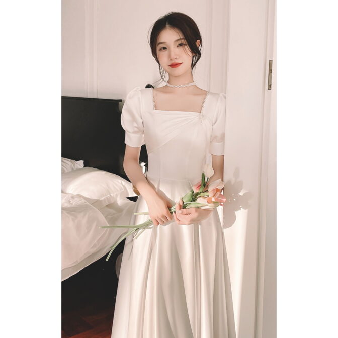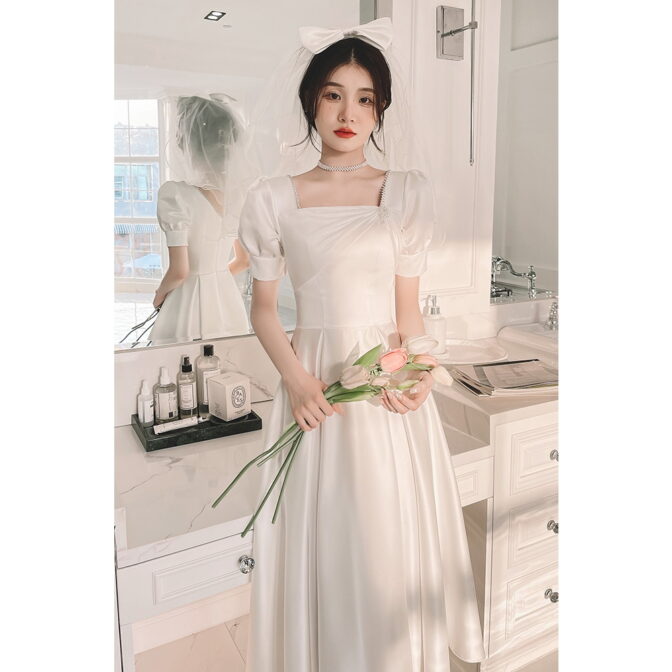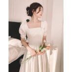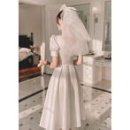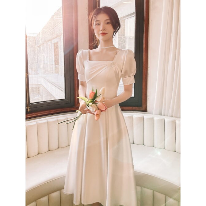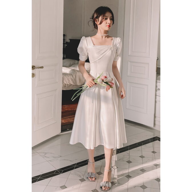 ホワイトの純白にパフスリーブが大人かわいい印象を与える、ミディアム丈のドレスです。結婚式やパーティーなどの特別な日にぴったりな一着です。