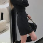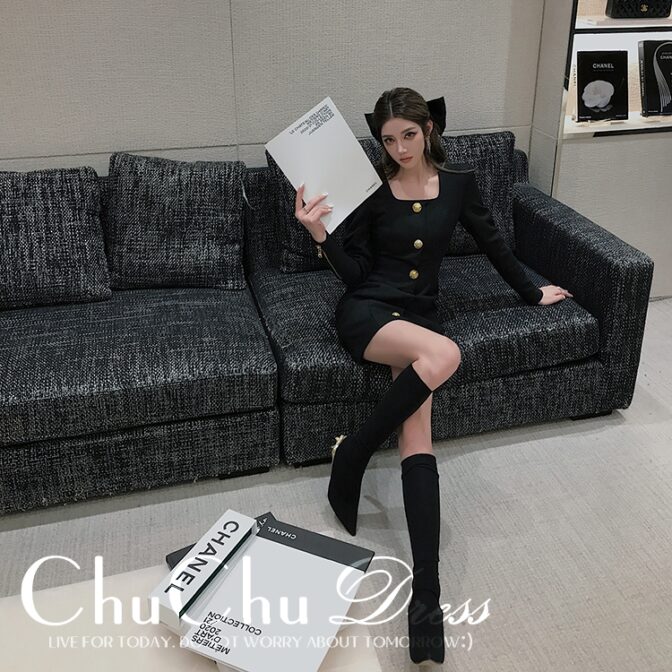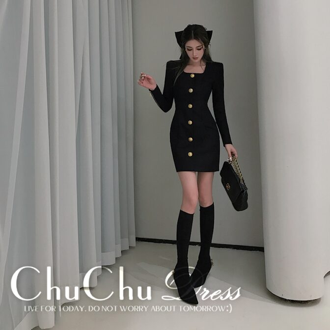 パーティードレス☆スクエアネック細身長袖ブラックワンピース XQ155