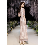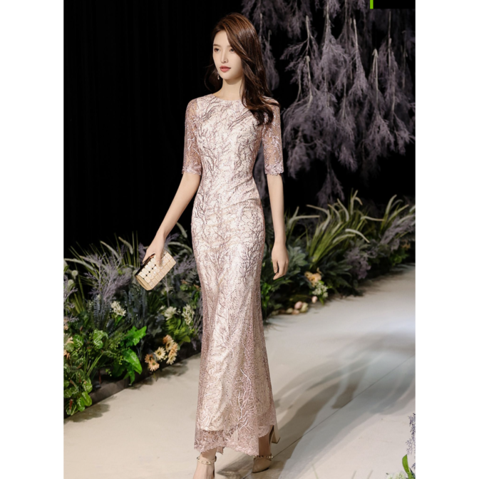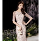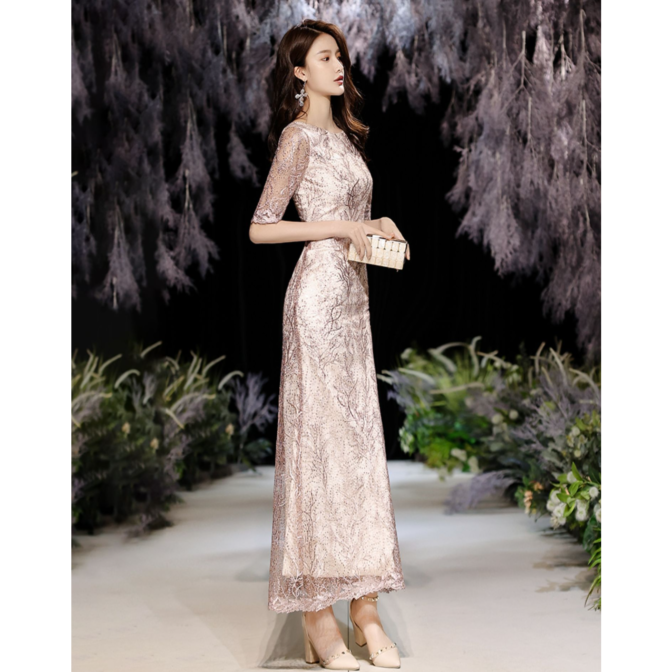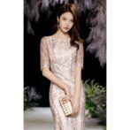 5分袖シンプルエレガント キラキラ☆ラメ縫製 ピンクドレス ME015