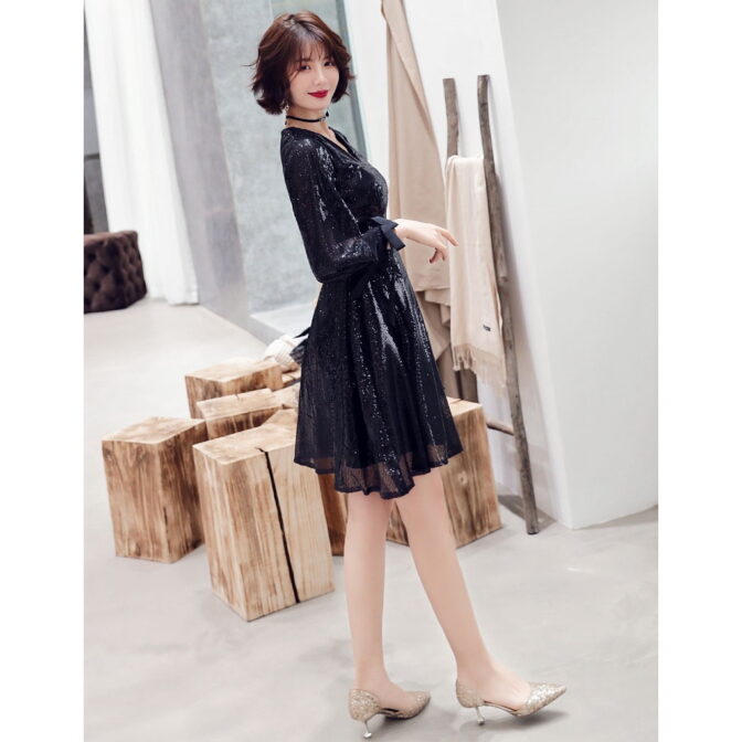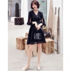Vネック キラキラ☆ミディ丈パーティードレス キュート袖リボン ME019