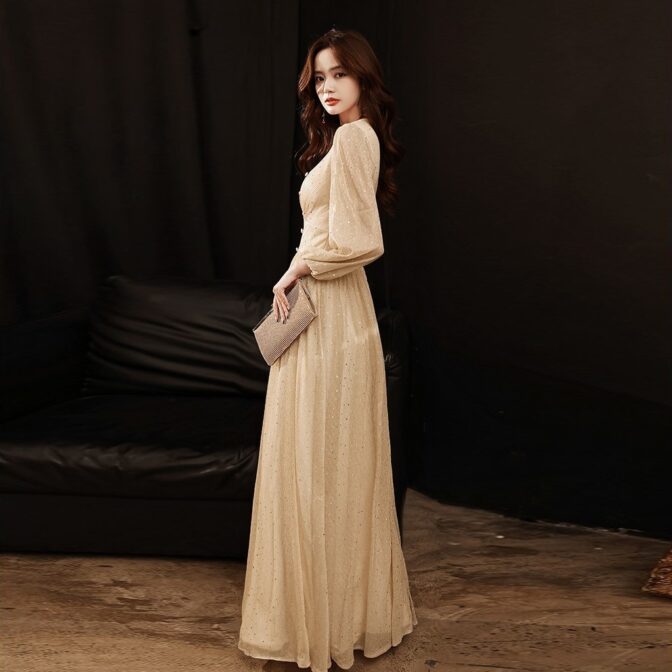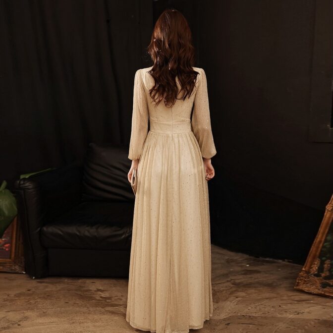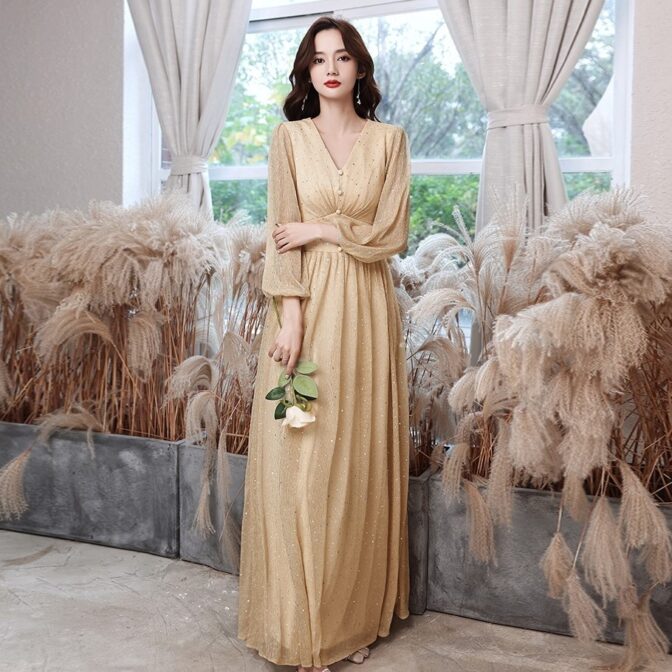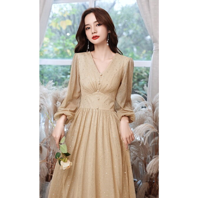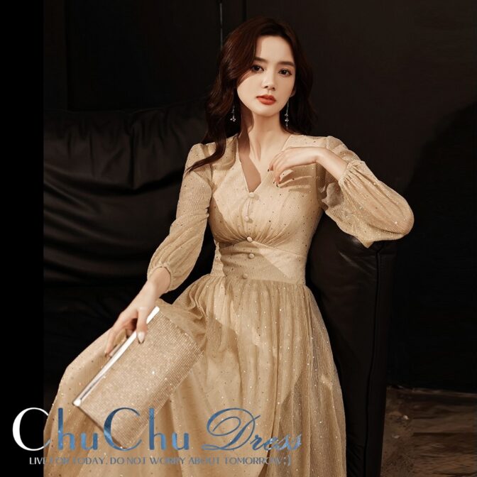 Vネック シャンパン 優雅 キラキラ ロングドレス パーティーは、華やかなパーティーシーンで輝きを放つ必須アイテムです。煌びやかなキラキラ素材とエレガントなVネックデザインが特徴であり、優雅な雰囲気を演出します。シックなシャンパンカラーが上品さを引き立て、どんな場面でも存在感を放ちます。
