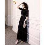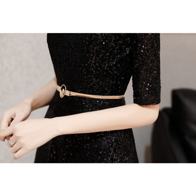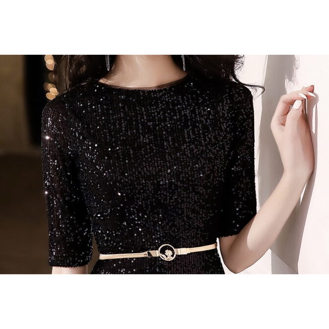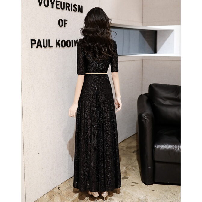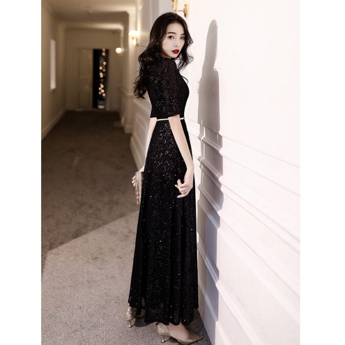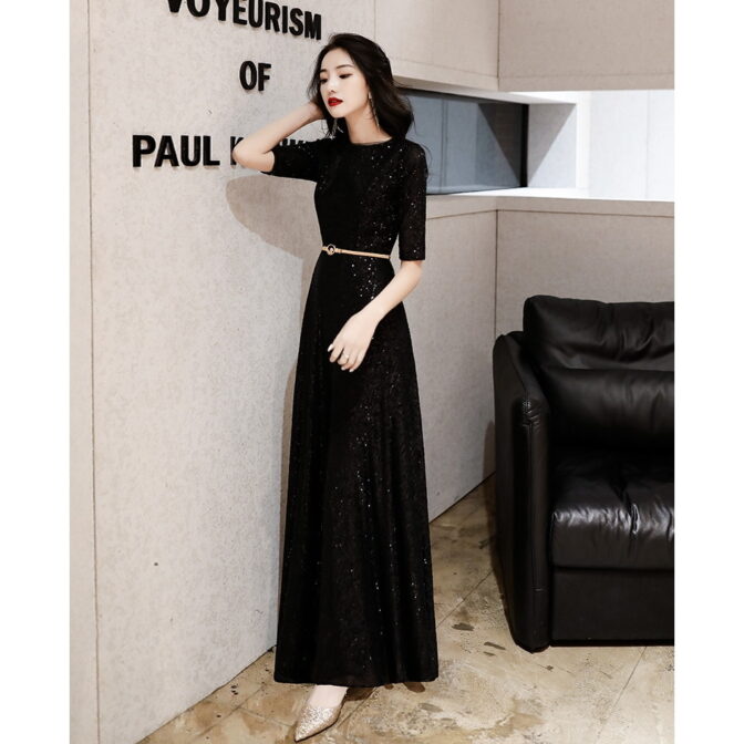 シンプル&ゴージャス 総ラメ装飾ブラックロングドレス 5分袖 ME032