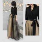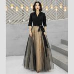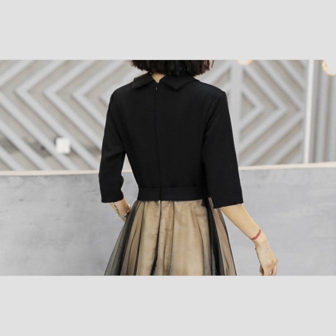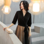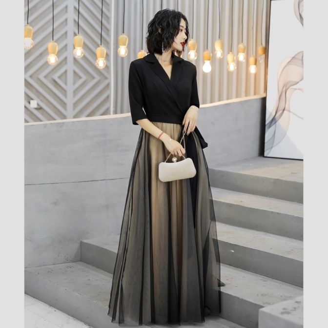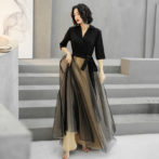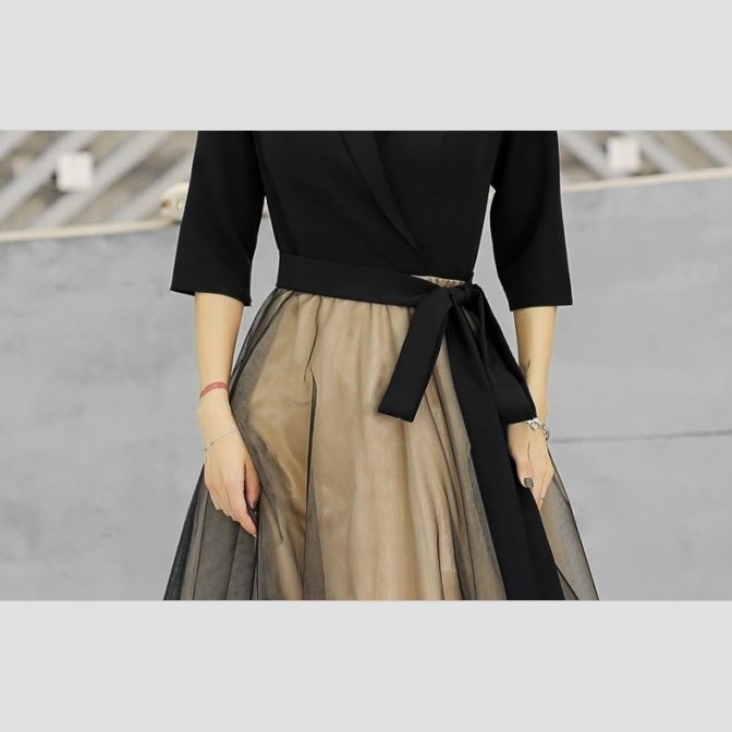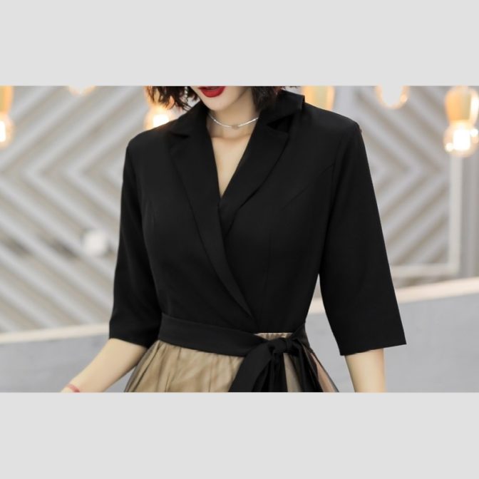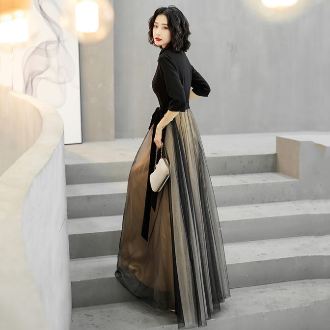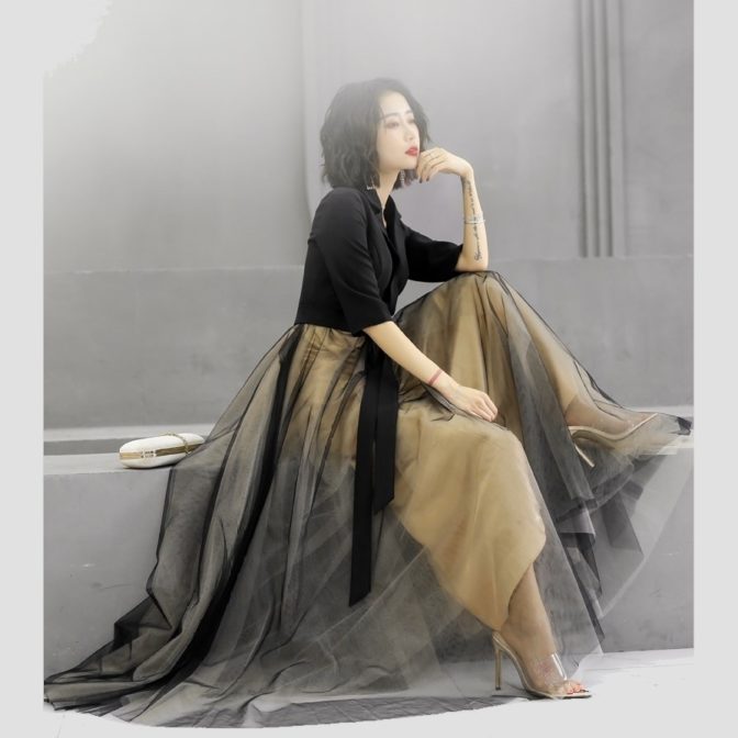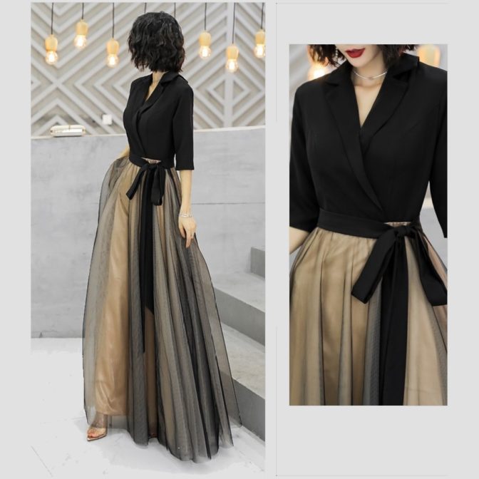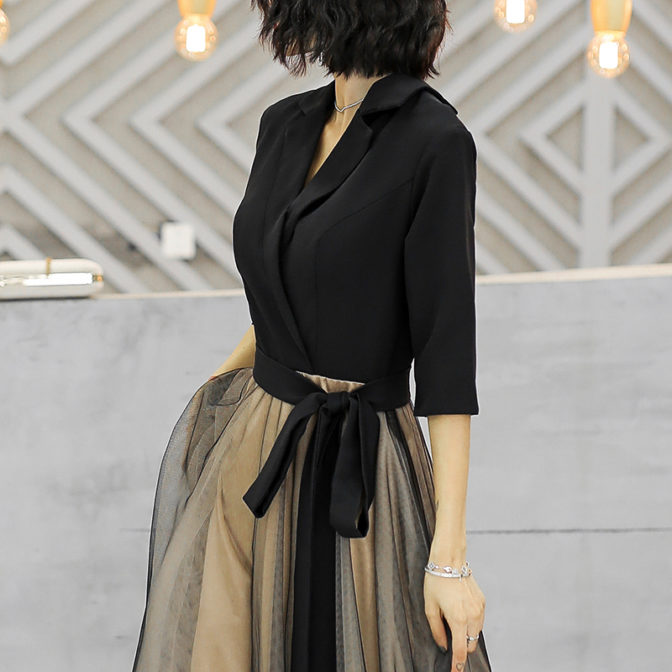 ジャケット風のトップスとチュールが組み合わさったバイカラーロングドレス。ウエストリボン付きで女性らしいかわいらしさをプラス。ドレスでありながら、トップスをジャケット風にするデザインは最近中国で人気のスタイルで、フォーマル感やスタイリッシュさを感じさせるデザインです。スカートはダブルチュールでふんわりとエレガントに。全体的に洗練された都会を感じさせるスタイルでパーティーなどのシーンでおススメです