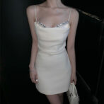 パール&ビーズ装飾☆ベージュワンピース パーティードレス結婚式 SH001