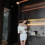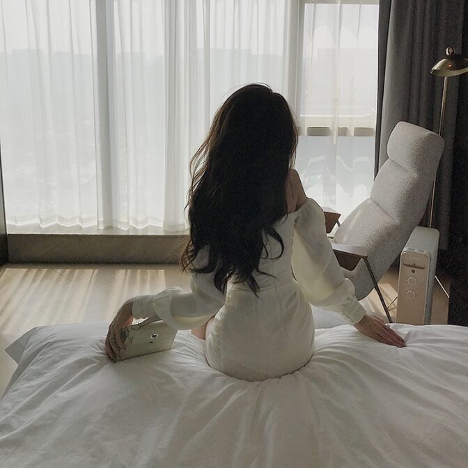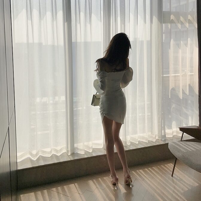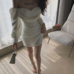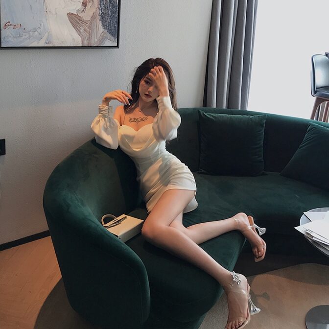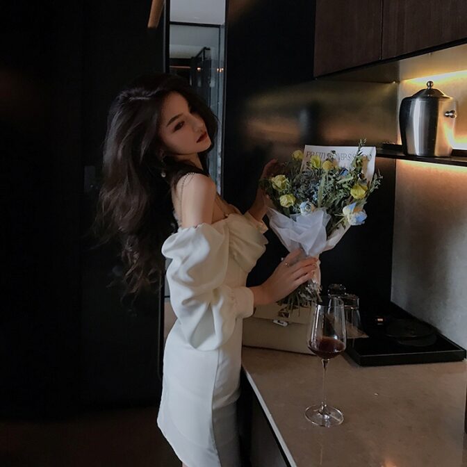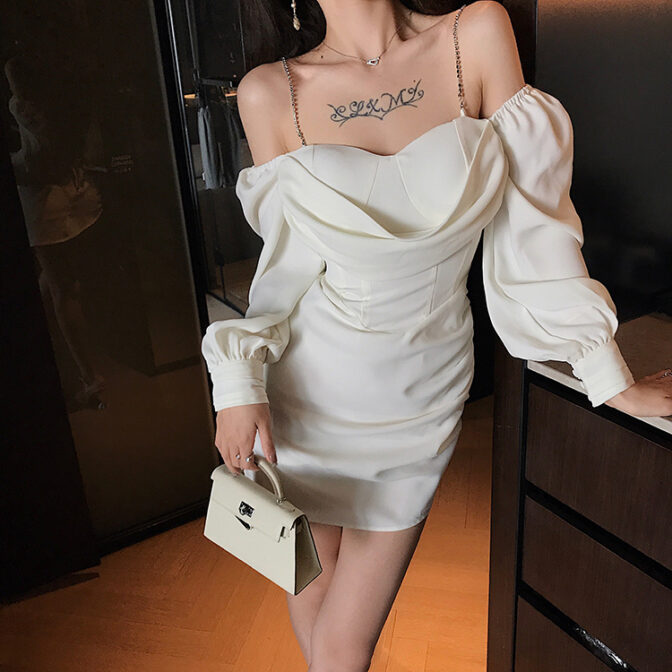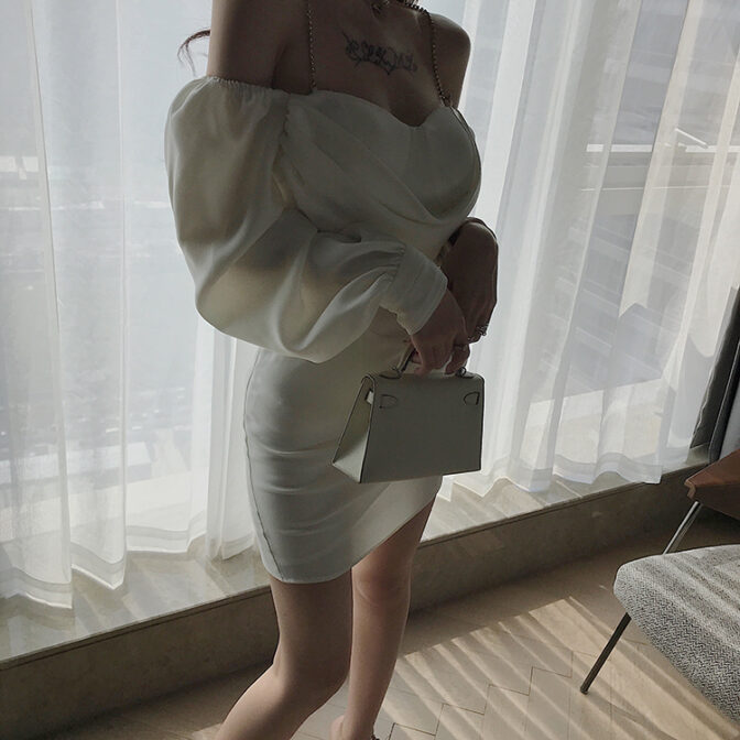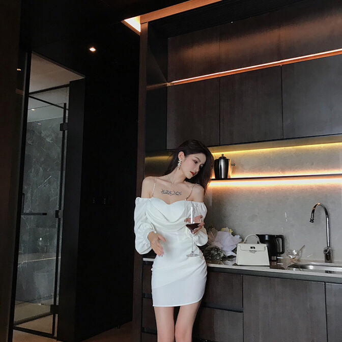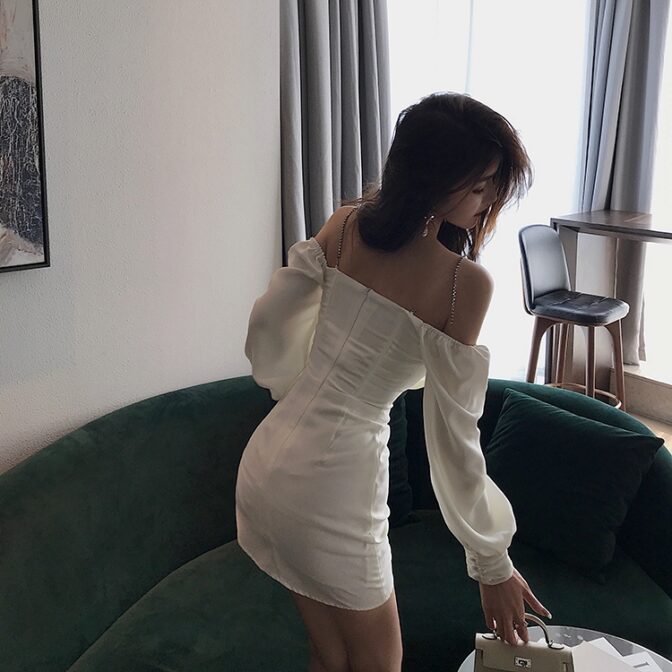 ビーズストラップ★バルーン長袖ホワイトショートワンピース XQ124